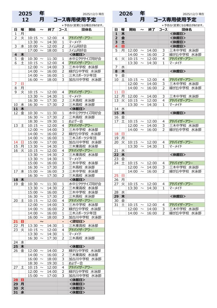 【12月・1月】屋内プール 休館日・貸切日・コース専用使用予定