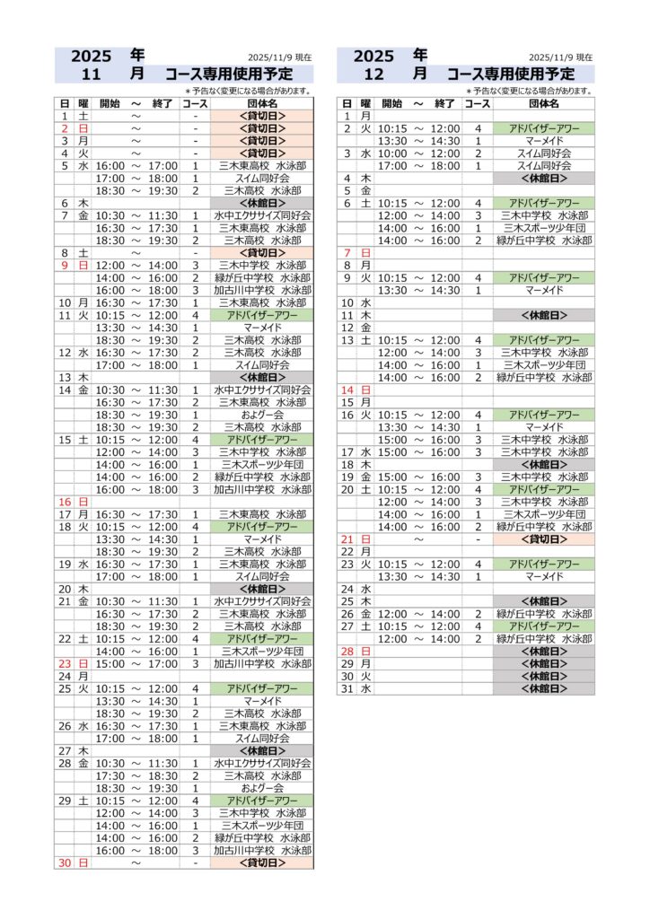 【12月・1月】屋内プール 休館日・貸切日・コース専用使用予定