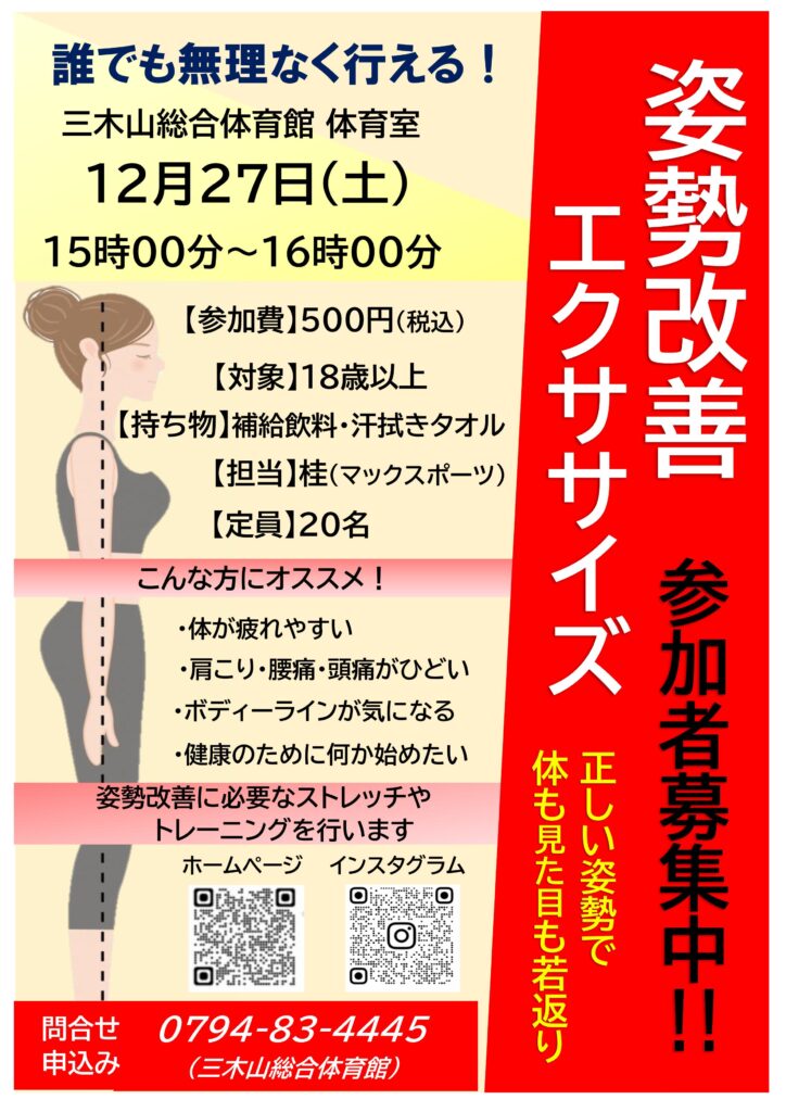 三木山総合体育館にて、姿勢改善のイベントを開催します(・∀・)