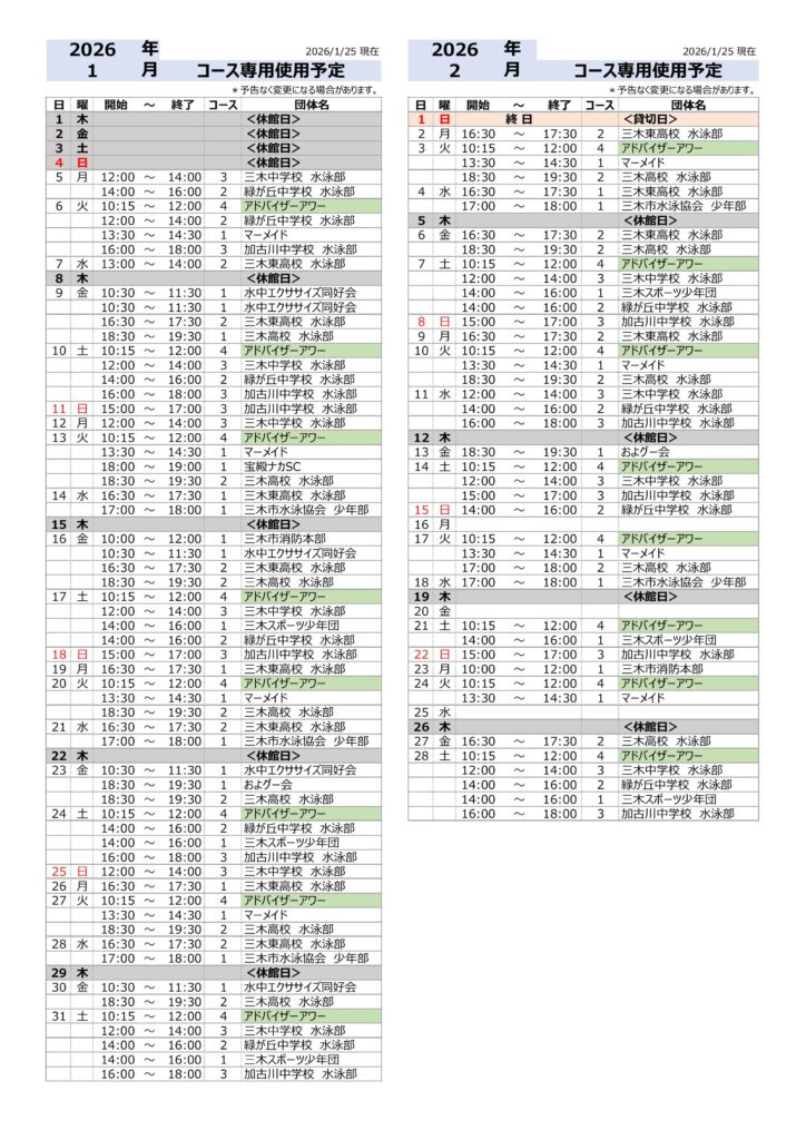 【1月・2月】屋内プール 休館日・貸切日・コース専用使用予定